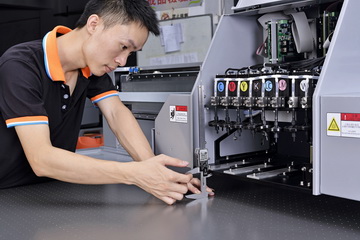 2.爲瞭(le)比同行更加出衆,我們與理光公司長(zhǎng)期保持合作關系,以細膩的墨滴,高耐磨的優勢,被客戶予以高度評價和認可,将高精度的噴頭和其他配件相結合,使之畫面更美,精度更高,色彩更豔。